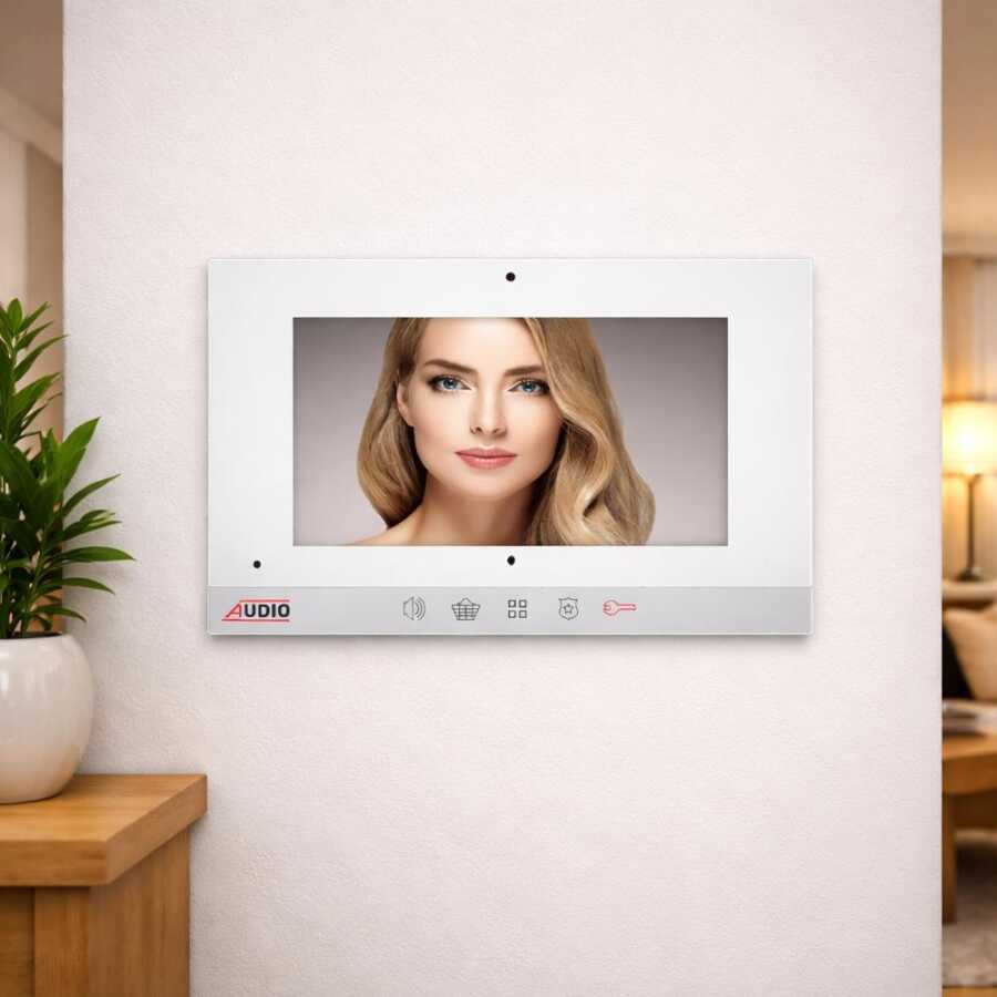 Audio 001192 Bus Plus, şık beyaz tasarımı ve 7 inç geniş ekranıyla apartman, site ve rezidanslarda güvenli iletişim sağlayan gelişmiş bir görüntülü diafon modelidir. Modern görünümüyle iç mekânlara uyum sağlarken, dokunmatik butonlu kullanım yapısı sayesinde hızlı ve pratik kontrol imkânı sunar.